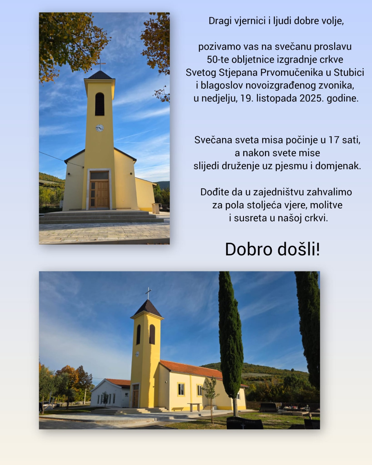 Pozivamo vas na svečanu proslavu 50. obljetnice crkve u Stubici i blagoslov novoizgrađenog zvonika, u nedjelju, 19. listopada 2025. godine.